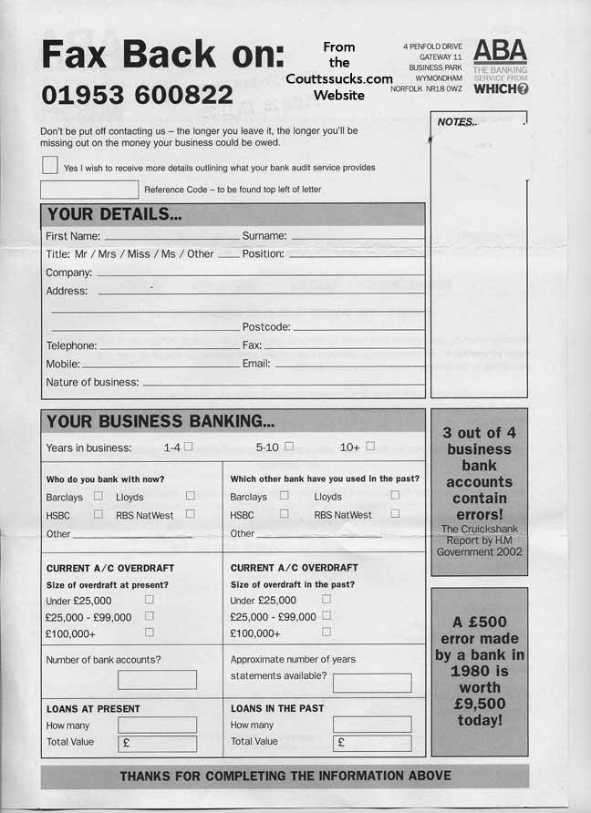 There was a letter from ABA - The Banking Service from Which Magazine.  The letter explained that "there's a 75% chance your bank owes you money" and went on to say, "however carefully you manage your business finances you could end up losing money as a result of errors made by your bank."